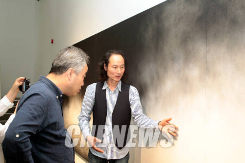 ▲9일 서울 통의동 아트사이드 갤러리에서 진행된 '달빛-물에 비치다'전 설명회에 함께한 이재삼 작가가 양평 호수가를 보고 그린 작품을 설명하고 있다.(사진=왕진오 기자)