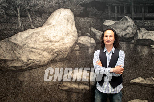 ▲9일 서울 통의동 아트사이드 갤러리에서 진행된 '달빛-물에 비치다'전 설명회에 함께한 이재삼 작가. 6월 10일부터 7월 2일까지 진행하는 개인전에 내놓은 보길도 세연정 작품앞에서 포즈를 취하고 있다. (사진=왕진오 기자)