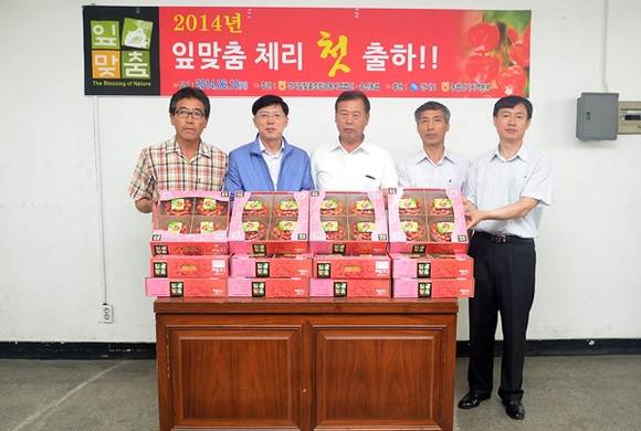 이날 첫 출하를 시작한 잎맞춤 체리는 포도 주산지로 유명한 화성시 송산에서 100% 시설재배로 생산해 철저한 품질관리를 통해 공동선별된 상품만을 7월 초순까지 출하해 소비자에게 판매할 예정이다.