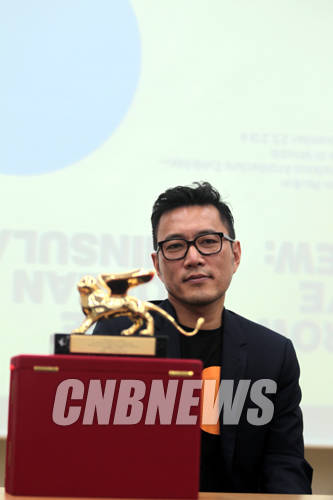 ▲12일 서울 대학로 예술가의 집 다목적홀에서 진행된 214 베니스 비엔날레 국제 건축전 황금사자상 수상자 조민석 커미셔너 귀국 기자회견에 함께한 조민석 커미셔너가 황금사자상을 앞에 놓고 취재진의 질문을 받고 있다.(사진=왕진오 기자)