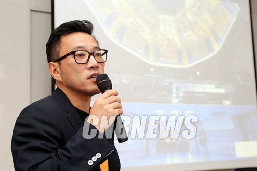 ▲12일 서울 대학로 예술가의 집 다목적홀에서 진행된 214 베니스 비엔날레 국제 건축전 황금사자상 수상자 조민석 커미셔너의 귀국 기자회견에서 조민석 커미셔너가 현지에서 진행한 전시 개요에 대해 설명하고 있다.(사진=왕진오 기자)