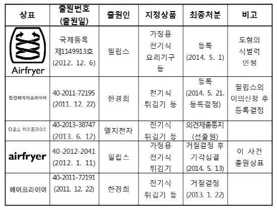 하지만 특허심판원은 필립스 제품 출시 이후 불과 5개월 후 같은 이름을 붙인 경쟁사 제품이 출시됐고, 인터넷 및 언론 매체에서도 ‘에어프라이어’ 명칭을 전기식 튀김기의 기능 또는 방식을 일반적으로 지칭하는 이름으로 사용해오고 있어 일반수요자들이 이 명칭을 필립스의 상표로 인식한다고 볼 수 없다고 판단했다.