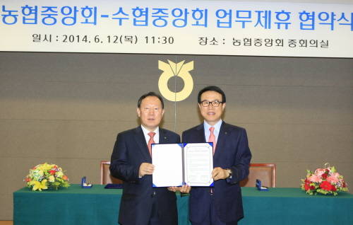 수협과 농협은 12일 서울 중구 농협중앙회 회의실에서 김영태 수협 지도경제대표이사와 이상욱 농협 농업경제대표이사를 비롯한 양 기관 주요 임직원이 참석한 가운데 ‘농어업인 소득 증대를 위한 업무협약(MOU)’를 체결하고 수산물과 농산물 판로 확대에 공동으로 협력키로 합의했다.