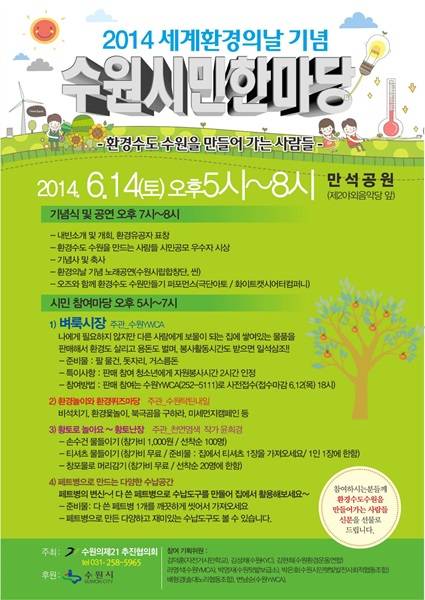 수원시가 제19회 세계 환경의 날을 맞아 오는 14일 만석공원 제2야외음악당에서 수원시민한마당을 개최한다.