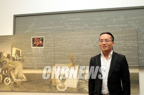 ▲13일 한국 첫 개인전을 위해 서울 소격동 아라리오 갤러리 서울을 찾은 옌헝 작가가 작품 앞에서 포즈를 취하고 있다.(사진=왕진오 기자)