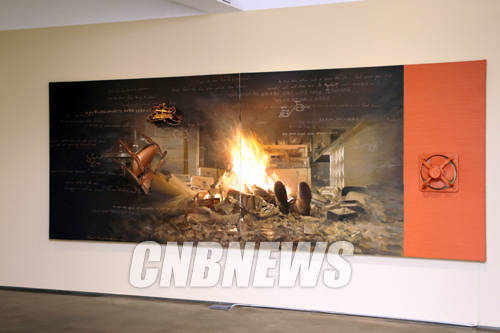 전시장에 걸린 작가의 작품들은 캔버스를 넘어 벽에까지 그림이 그려져 있어 눈길을 모은다. 이 작품은 한국 전시를 위해서 작가가 직접 그려 넣은 것이다.