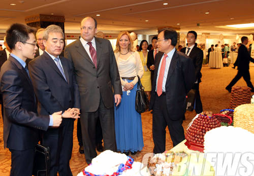 ▲13일 러시아 모스크바에 위치한 롯데호텔에서 한-러 상호방문의 해와 관련 ‘한국문화관광대전 개막식’이 열렸다. 이날 참석한 유진룡 문화체육관광부 장관(좌측에서 두번째)이 올렉 사포노프 러시아 관광청장과 함께 한국 홍보부스를 관람하고 있다.(사진=문체부)