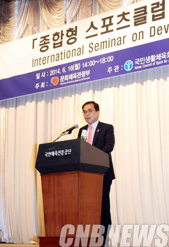 ▲16일 서울 올림픽파크텔에서 종합형 스포츠클럽 발전 방안 국제세미나가 열렸다. 이번 세미나는 국내 19개 종합형 스포츠클럽의 운영 성과를 점검해 보고, 영국· 일본 등 생활체육 선진국의 스포츠클럽 운영 성과와 문제점 공유를 통해 국내 실정에 맞는 스포츠클럽의 발전 방안을 모색하기 위해 마련되었다. 이날 참석한 김종 문화체육관광부 제2차관이 인사말을 하고 있다.(사진=문체부)