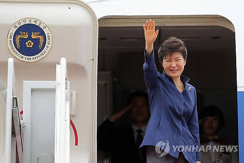 ▲우즈베키스탄과 카자흐스탄, 투르크메니스탄 등 중앙아시아 3개국 국빈방문을 하는 박근혜 대통령이 16일 오전 서울공항에서 전용기에 탑승하며 환송객들에게 손을 들어 인사하고 있다. (사진=연합뉴스)