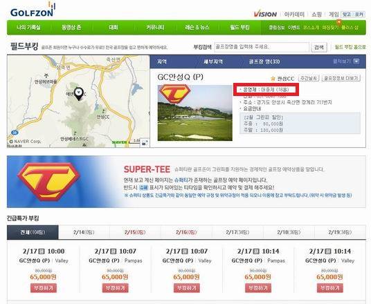 ▲골프존은 ‘골프클럽Q안성’을 퍼블릭골프장으로 전환 신청했지만 관할청인 경기도는 관계법령에 근거가 없다며 신청을 반려했다. 그럼에도 불구하고 골프존은 자사 홈페이지를 통해 ‘골프클럽Q안성’이 퍼블릭 골프장인 것처럼 홍보해 물의를 빚었다. 지난 2월13일 ‘골프클럽Q안성’를 ‘대중제(퍼블릭)’로 부킹 예약 받고 있는 홈페이지 화면을 CNB가 단독 캡쳐했다.