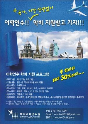 인턴십을 계획하고 있거나 어학연수가 필요한 학생들을 위해 영어권 국가(미국, 영국, 캐나다, 호주, 뉴질랜드, 필리핀 등)라면 어디든 기간·과정에 상관없이 학비를 최대 30%까지 지원할 예정이다.
