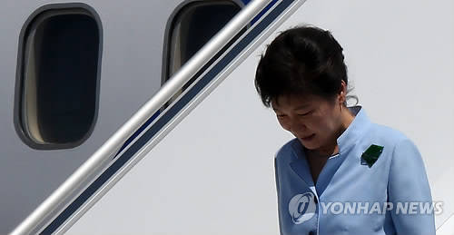 ▲박근혜 대통령이 18일 우즈베키스탄 사마르칸트 공항에 도착, 전용기에서 내리고 있다. 박 대통령은 타슈켄트를 떠나기 전 민경욱 대변인을 통해 문창극 총리의 임명동의안 재가를 귀국해 결정하겠다고 밝혔다.(사마르칸트(우즈베케스탄)=연합뉴스)