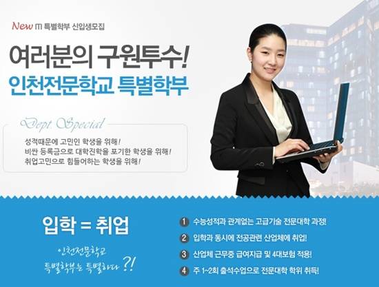 인천전문학교 관계자는 "성적 때문에 고민인 학생, 비싼 등록금으로 대학진학을 포기한 학생, 취업고민으로 힘들어하는 학생, 빠른 사회경력으로 앞서나가고 싶은 학생을 위해 '입학동시취업' 시스템을 도입했다"며 "이 내용이 TV 뉴스에도 방영돼 현재 많은학생들이 지원하고 있다"고 밝혔다.