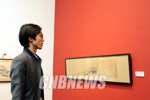 ▲13회 마이아트옥션 메인경매에 출품된 추사 김정희의 시우란 작품을 김정민 경매사가 살펴보고 있다.(사진=왕진오 기자)