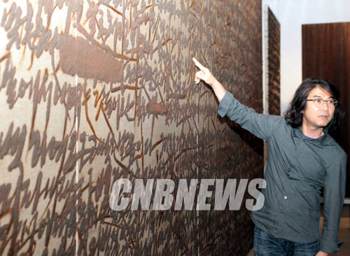 ▲서울 평창동 김종영미술관에서 6월 13일부터 7월 31일까지 2014 오늘의 작가 김종구전 '형태를 잃어버렸어요. 쇳가루 산수화'전을 펼치고 있는 김종구(51)작가가 쇳가루를 물감삼아 쓴 6000자의 자기 독백 작품을 설명하고 있다.(사진=왕진오 기자)