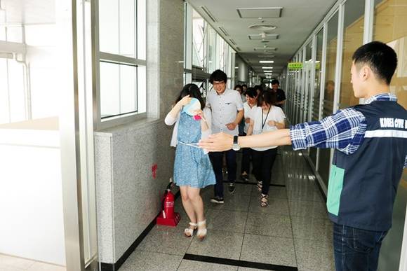 이번 훈련은 소방방재청 중앙민방위경보통제소의 음성경보발령에 따라 건물 내 주민들이 밖으로 대피하는 화재대피훈련으로 실시됐다.