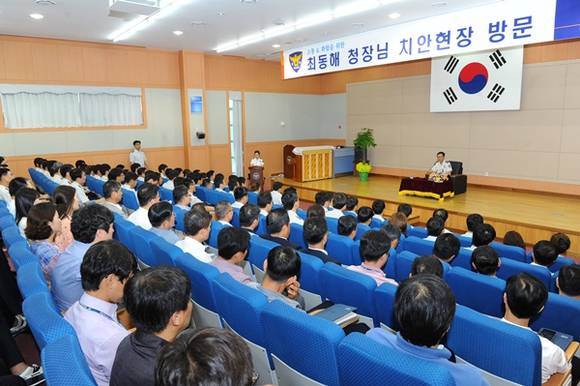 최 청장은 이 자리에서 행정발전에 힘쓰고 치안서비스 향상에 기여해 주민들과의 체감안전도를 높이는데 기여한 황인용 경사와 김일아 직원등 3명에 대해 업무유공으로 표창장을 수여하며 직원들을 격려한뒤 현장직원들의 건의사항 청취로 소통의 시간을 가졌다.