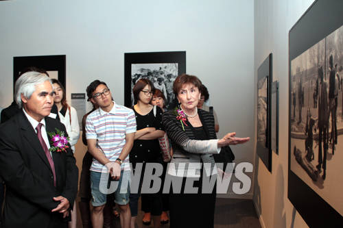 이날 함께한 전시 큐레이터 시마 루빈(우측)과 네이팜 소녀 사진의 작가 닉 우트(맨 좌측)가 전시된 수상작품을 감상하고 있다.