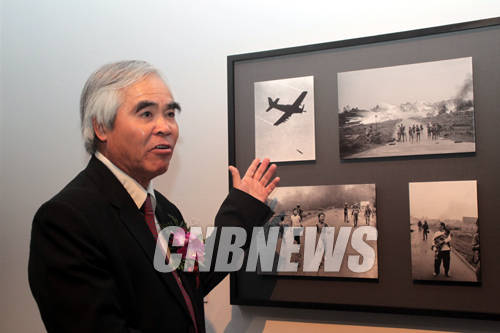 ▲23일 오후 서울 예술의전당 한가람디자인미술관에서 '순간의 역사, 끝나지 않는 이야기-퓰치처상 사진전'이 개막했다. 이날 베트남전의 참상을 전세계에 고발하며 1973년 퓰리처상을 수상한 닉 우트가 1973년 촬영한 '베트남-전쟁의 테러'작품앞에서 당시 촬영 에피소드를 이야기 하고 있다.(사진=왕진오 기자)