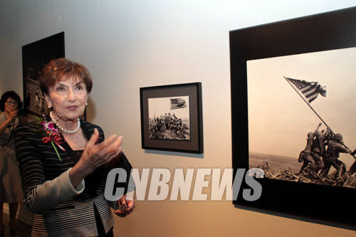▲23일 오후 서울 예술의전당 한가람디자인미술관에서 '순간의 역사, 끝나지 않은 이야기-퓰리처상 사진전'이 개막했다. 이날 함께한 퓰리처상 큐레이터 시마 루빈이 조 로젠탈의 '성조기, 수리바치 산에 게양되다'작품을 설명하고 있다.(사진=왕진오 기자)