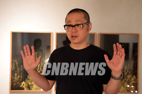 ▲서울 삼청로 학고재 갤러리에 전시된 '뼈와 살이 타는밤' 작품을 설명하고 있는 양아치 작가.(사진=왕진오 기자)