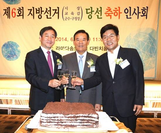 24일 유정복 인천광역시장 당선인이 인천상공회의소 당선 축하 인사회에 참석해 이청연 인천시교육감과 함께 기념촬영을 하고 있다.