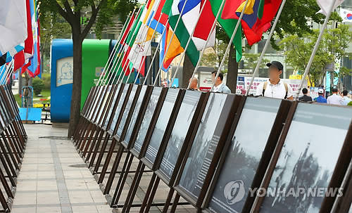 6·25 전쟁 발발 64주기인 25일 오후 서울 태평로에서 (사)월드피스자유연합이 주최한 한국전 관련 사진전이 오가는 시민들의 관심을 끌지 못한 채 한산한 모습을 보이고 있다.