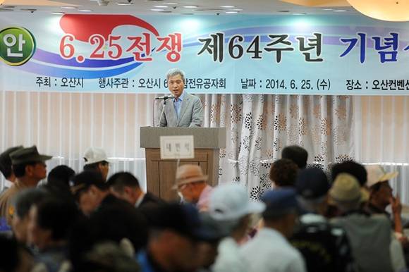 오산시(시장 곽상욱)는 25일 오전 관내 오산컨벤션웨딩홀에서 곽상욱 시장, 안민석 국회의원, 시의원 등을 비롯한 비롯한 기관·단체장, 참전유공자, 유공자 가족 등 300여명이 참석한 가운데 제64주년 6·25전쟁 기념식이 개최했다.