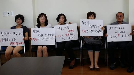 ▲새정치민주연합 당원들이 30일 탈당 기자회견장인 고양시의회 영상회의실에서 탈당한 2명의 시의원을 비난하는 푯말을 들고 있다.