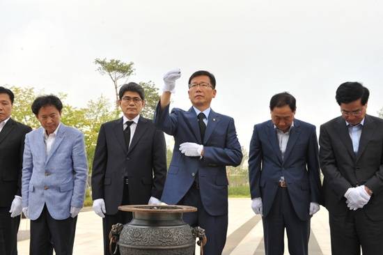 ▲유영록 김포시장이 취임 첫 날을 맞아 현충탑 참배를 하고 있다.