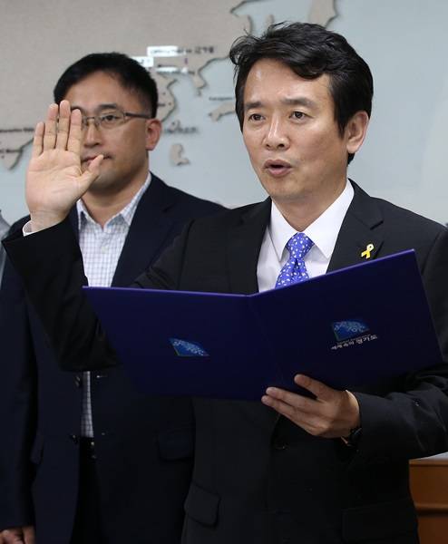 ▲남경필 경기도지사가 1일 오전 세월호 희생자 정부합동분향소를 찾아 희생자들의 안식을 기원하고 오후에 경기도청에서 청원경찰과 소방관,노조위원장 등이 참가한 가운데 경기도지사 취임 선서를 하고 있다.(사진=연합뉴스 제공)