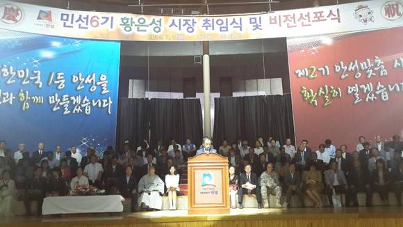 민선 6기 황은성 안성시장의 취임식 및 비전선포식이 1일 관내 기관 ․ 사회단체장, 시민 등 500여 명이 참여한 가운데 안성남사당전용공연장에서 개최되었다.