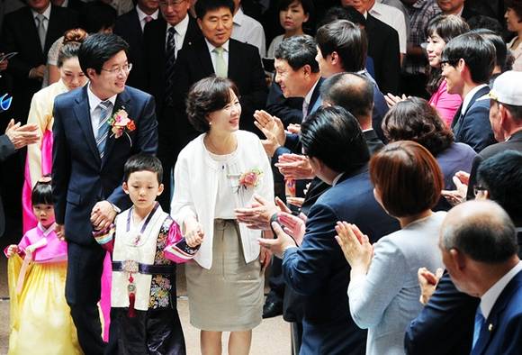 시청에 도착한 염 시장은 수원어머니합창단 축가 속에 본관 홀에 입장해 시민을 대표한 유시아(6.수원시 재향군인회장 손녀) 양의 축하 꽃다발을 받고 취임식장에 섰다.