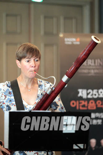 ▲2일 서울 중구 소공동 플라자호텔에서 제25회 이건음악회 초청 연주자 베를린 필하모닉 윈드퀸텟의 언론설명회가 열렸다. 이날 함께한 연주단의 메리언 라인하르트가 바순을 연주하고 있다.(사진=왕진오 기자)