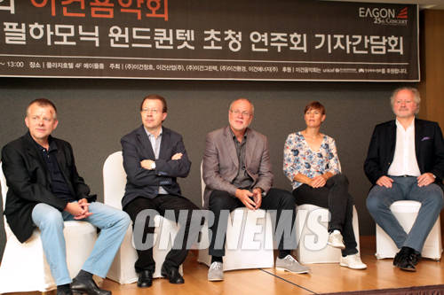 ▲2일 서울 중국 소공동 플라자호텔에서 제25회 이건음악회 베를린 필하모닉 윈드퀸텟 초청연주회 언론설명회가 열렸다. 이날 함께한 윈드쾬텟이 취재진의 질문을 받고 있다.(사진=왕진오 기자)