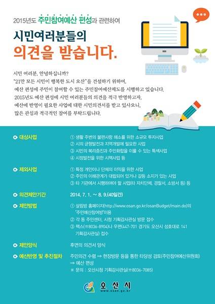주민참여예산시민사업에공모하고싶은시민은오산시청살림방홈페이지(http://www.osan.go.kr/osanBudget)‘예산참여방’을이용하거나 각 동 주민센터, 시청 민원실, 기획감사관을 직접 방문해 제출하면 된다.
