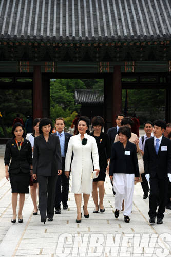 이날 그의 부인인 펑리위안 여사가 조윤선 정무수석과 나선화 문화재청장의 안내로 서울 창덕궁 경내를 둘러보고 있다.