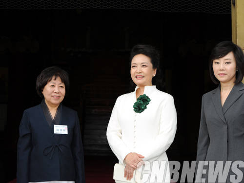 ▲3일 한중 정상회담을 위해 방한 중인 시진핑 중국 국가주석의 부인 펑리위안 여사가 조윤선 정무수석(맨우측)과 나선화 문화재청장과 함께 창덕궁 경내 안내를 받고 있다.(사진=문화재청)