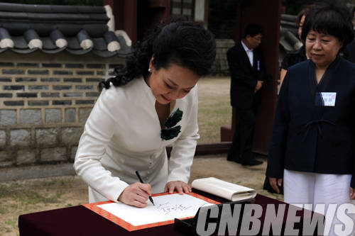 ▲3일 한중 정상회담을 위해 방한 중인 시진핑 중국 국가주석의 부인 펑리위안 여사가 나선화 문화재청장의 안내로 방명록에 사인을 하고 있다.(사진=문화재청)