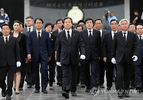 ▲새누리당 7․14 전당대회에서 친박계 좌장인 서청원 의원과 당권 경쟁에 나선 김무성 의원이 공식적인 경선 첫날인 3일 오전 동작동 현충원을 방문하면서 박정희 전 대통령 묘역을 참배하겠다고 공식발표 했으나 박 전 대통령 묘역은 지나치고 무명용사 묘역만 참배한 것으로 알려져 그 배경에 대해 많은 논란이 되고 있다. 무명용사 묘역을 참배를 위해 현충탑으로 이동하고 있는 김 의원. (사진=연합뉴스).