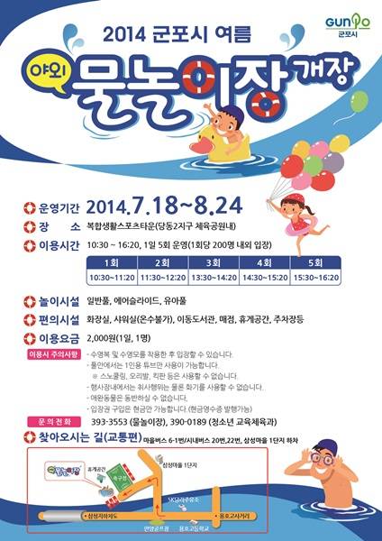 군포시가 오는 18일부터 8월 24일까지 38일간 군포당동2 보금자리주택지구 내 체육관 건립 예정지(부곡동 1226번지 일원)에 '2014 여름 야외 물놀이장'을 조성․운영한다.