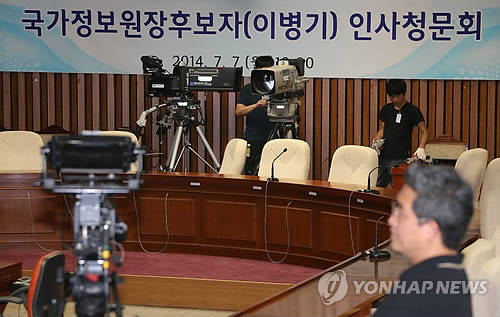 ▲이병기 국정원장 후보자 인사청문회를 하루 앞둔 6일 국회 청문회장에서 생방송 할 방송사 관계자들이 청문회 준비를 하고 있다. (사진=연합뉴스)