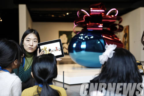 ▲삼성미술관Leeum, 제프 쿤스의 리본묶은 매끄러운 달걀을 설명하는 현장.(사진=삼성미술관 Leeum)