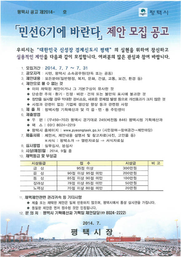 평택시(시장 공재광)는 민선6기 출범을 맞이하여 “대한민국 신성장 경제신도시 평택”을 만들기 위한 시민 및 공무원의 참신하고 다양한 제안을 7일부터 31일까지(25일간) 받기로 했다.