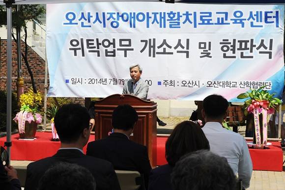 이날 센터 업무개소 및 현판식은 지난 2008년 개원이래 평화교회와 한신대 산학협력단에서 위탁 운영하던 장애아 재활치료 교육센터를 올해 6월부터 오산대학 산학협력단에서 향후 3년간 운영하게 됨에 따라 이뤄졌다.