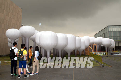▲8일 서울 삼청로 국립현대미술관 서울관에서 국립현대미술관(관장 정형민), 현대카드(사장 정태영)가 공동 주최하는 '현대카드 컬처프로젝트 15_젊은 건축가 프로그램' 언론설명회가 열렸다. 이날 미술관 앞마당에 설치된 문지방의 '신선놀음' 작품을 관람객들이 감상하고 있다.(사진=왕진오 기자)
