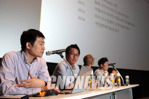 이날 올해 프로그램의 건축가로 최종 선정된 프로젝트팀 '문지방'이 작업에 대해 취재진을 질문을 받고 있다.