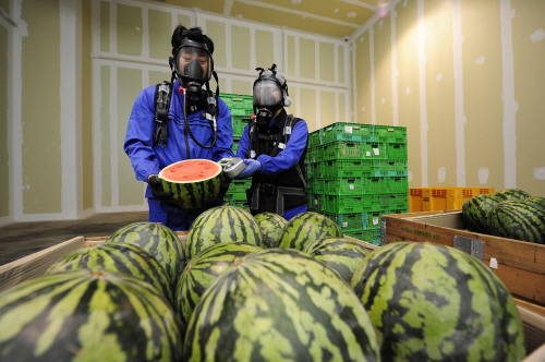 ‘CA저장 수박’은 지난주 비가오기 이전에 수확한 맹동과 고창 지역의 당도 높은 수박(평균당도 12.5 브릭스)을 첨단 신선식품 유통센터인 ‘CA 저장고’에 저장한 상품이다.