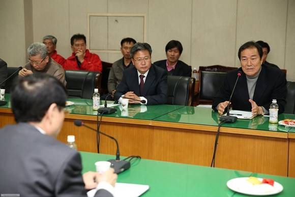 ▲2013년 11월 12일 남양동을 방문한 안전행정부 김기수 정책관이 채인석 시장을 비롯한 남양주민들과 읍전환과 관련해 간담회를 가졌다.(사진=화성시 제공)