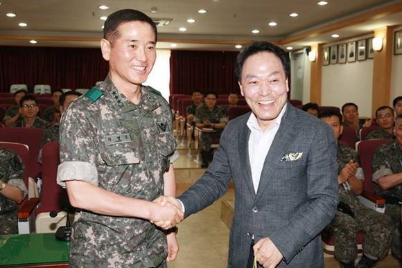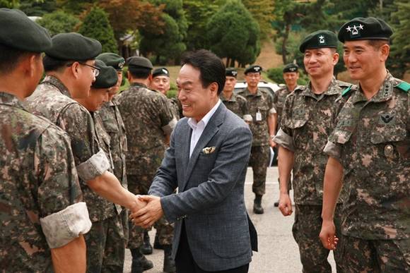 ▲이필운 안양시장이 수도군단을 방문해 최병로 부대장과 상호 우호협력을 강조하고 장병들과 악수하고 있다.(사진=안양시 제공)